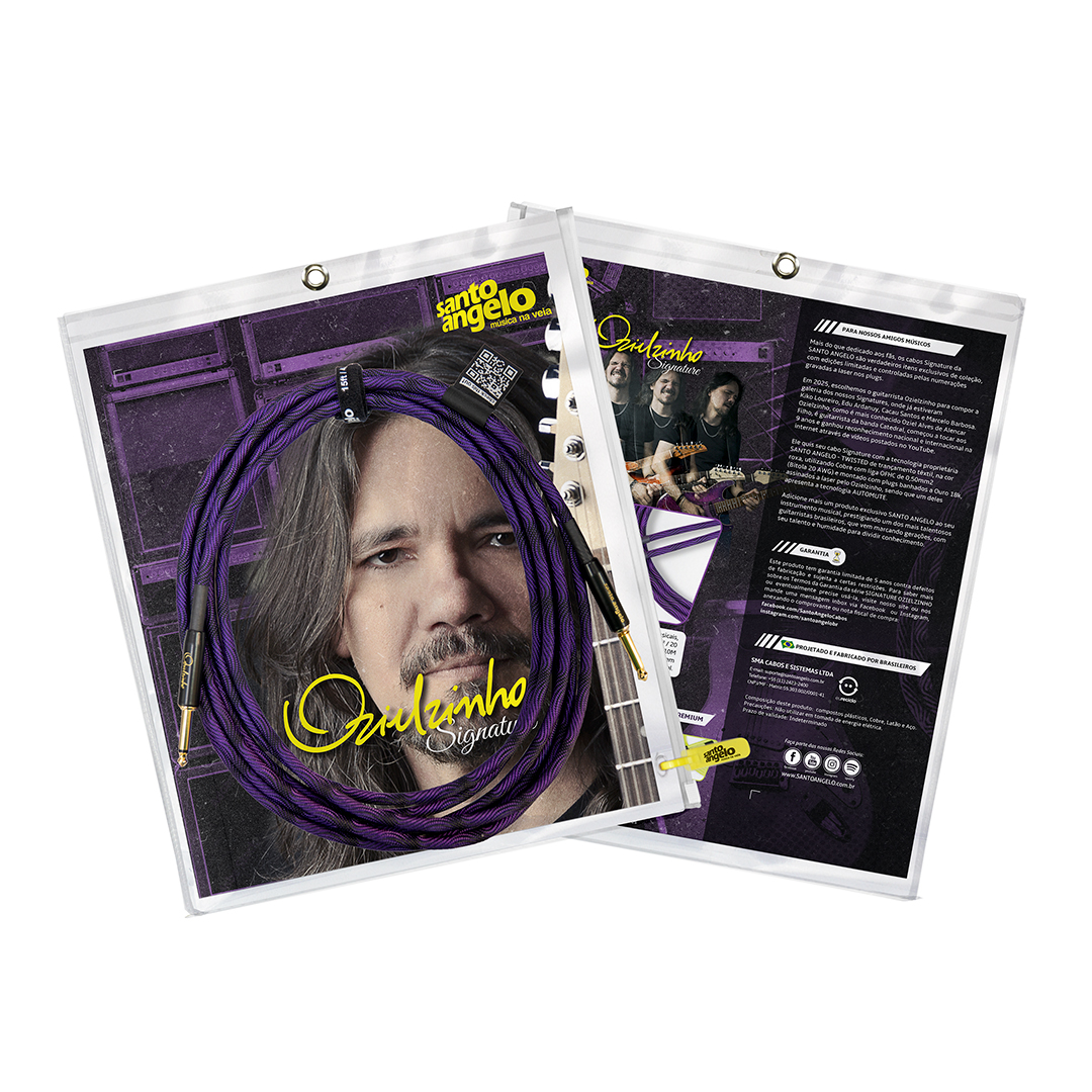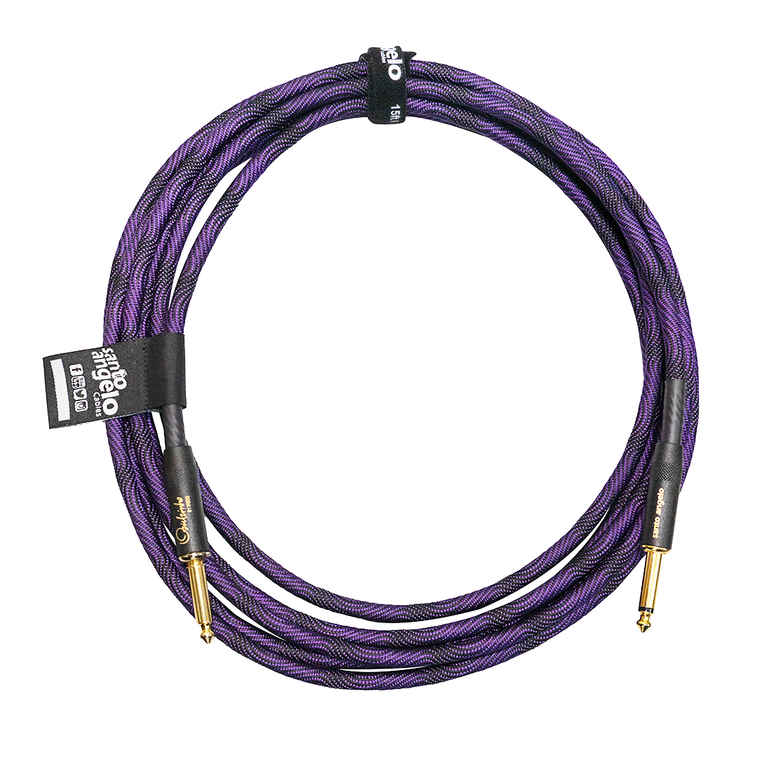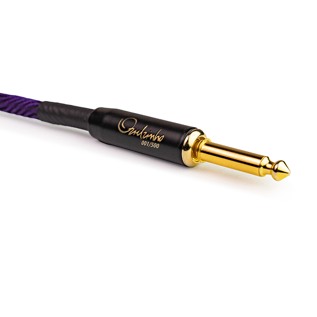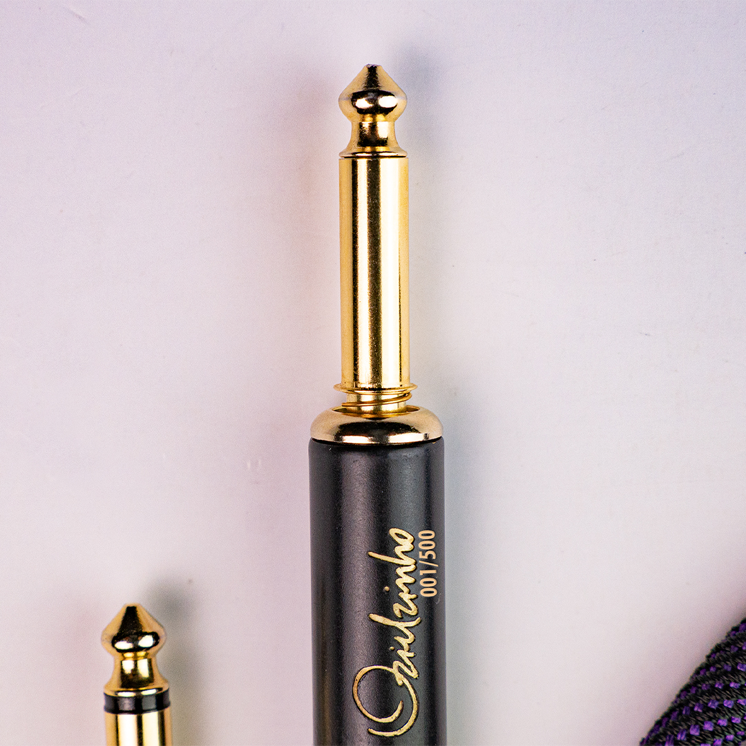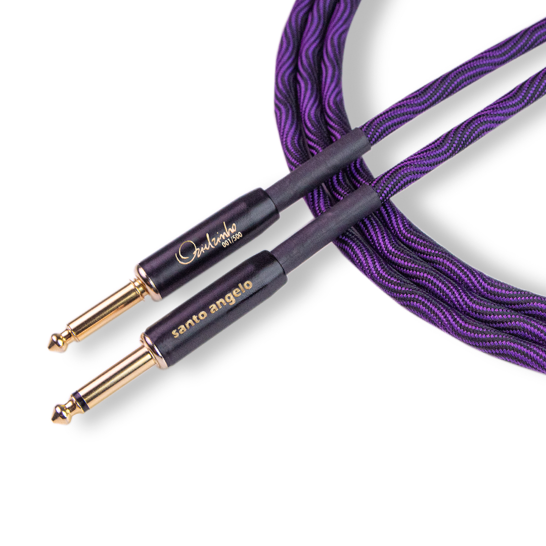 Cabo para interligação de instrumentos musicais, montado com cabo SANTO ANGELO G50T (0,50mm² / 20 AWG) têxtil na cor roxa e conectores P10M x P10M banhados a Ouro 18K, com capa personalizada em pintura epóxi e gravação a laser com número sequencial.